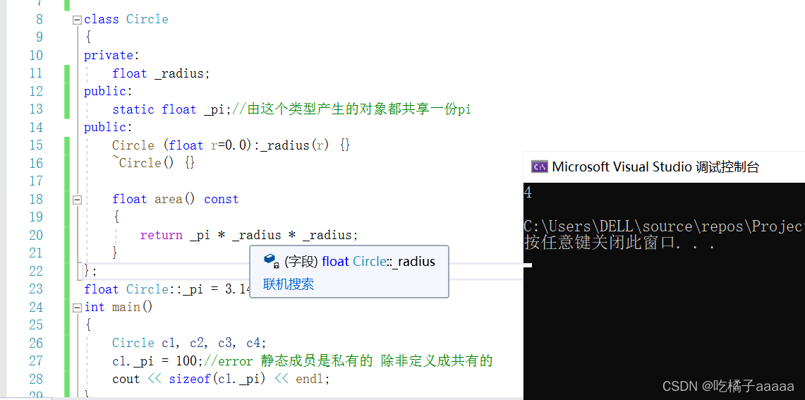 - 当类的静态数据成员为公有时可以在外部函数使用:类名:静态数据成员名或对象.静态数据成员名.可以在类体中定义自身的静态类型对象.