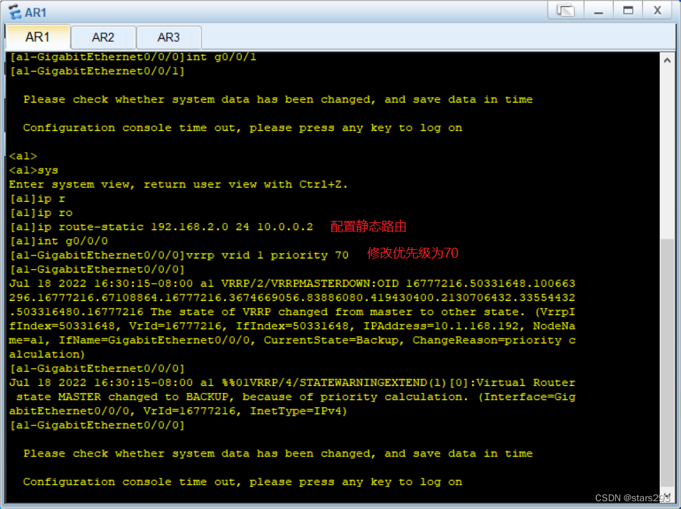 The priority is set to 120 When I pass by AR1 therefore ping 20.0.0.1 no