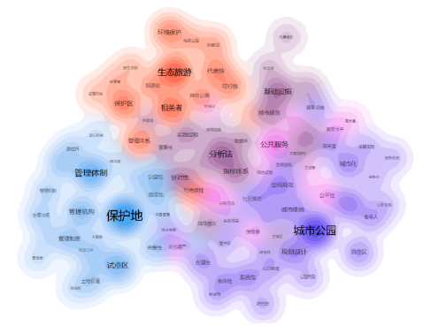 In order to intuitively feel the visualization effect of the technology theme map fused with clustering information in this paper , Compare it with the form of thermal diagram 、 Density chart form 、 Compare the form of topographic map , Use the same subject word extraction method 、 The same density function calculation parameters 、 The same layout algorithm , The result is as follows chart 2- chart 7 Shown . From the perspective of technical implementation and theme content disclosure , The implementation of density diagram and thermal diagram is relatively simple , But it cannot effectively distinguish the boundaries of technical topics , In particular, the revealing effect of density map is poor , This is also the reason why density map is less used in the field of Library and information . The implementation complexity of multi-color topographic map and monochrome topographic map technology has increased , Although it is still unable to effectively reveal the theme boundary 、 The relationship between themes , But the sense of hierarchy of the same theme is stronger . Multicolor topographic maps use colors to distinguish theme intensity 、 How many subject words , Insufficient disclosure of the relationship between themes . Technology topic map integrating clustering information , The complexity of technology implementation is relatively high , But for the boundary between themes 、 The relationship between themes 、 The number of subject words in the subject has better revealing ability , Visualization is more acceptable to human visual system . chart 6- chart 7 Are the visualization results using two color intensity functions , The color intensity in the form of power function has a more moderate color change trend , It is applicable to those cases where there is a large gap in the number of subject words .