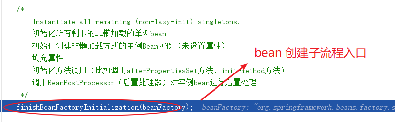 - 通过最开始的关键时机点分析,我们知道Bean创建⼦流程入口在AbstractApplicationContext#refresh()方法的finishBeanFactoryInitialization(beanFactory) 处