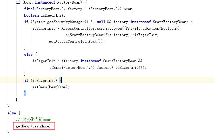 - 继续进入DefaultListableBeanFactory类的preInstantiateSingletons方法,我们找到下面部分的代码,看到工厂Bean或者普通Bean,最终都是通过getBean的方法获取实例