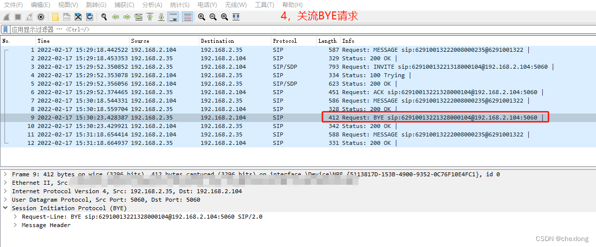 抓包对象:上级SIP信令网关,与下级SIP域服务(网络摄像机)之间的信令。