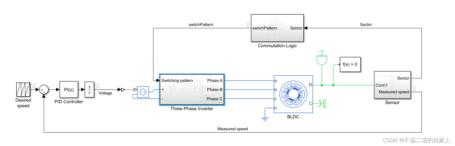 首先,先建立一个霍尔传感器获取电机的角位置和速度,将转子内的区域划分为6个扇区,霍尔传感器不会提供转子的具体位置信息,但是可以检测转子何时从一个扇区转到另一个扇区,而且实际上只要知道位置信息,就可以对电机进行换向,这个时候又不知道换A/B/C的哪两个,因此需要采用换向逻辑,通过此逻辑确定三相逆变器开关,如下图2