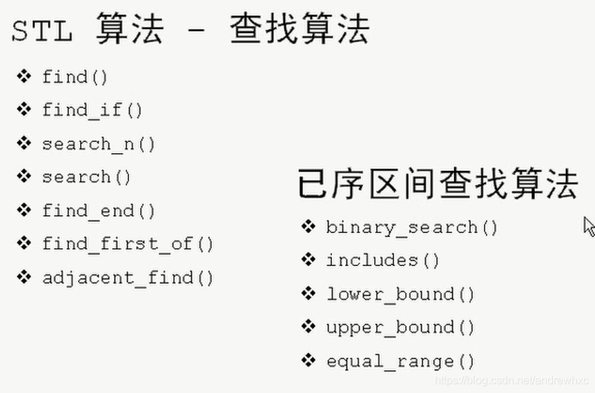 All the algorithms in the following figure are applicable to any container , In the first red box is the exact search algorithm , The second red box is to find a piece of data that matches continuously , The third red box is to find the first data that appears , The first 4 The red box is to find continuous 2 Data that conforms to predicate rules