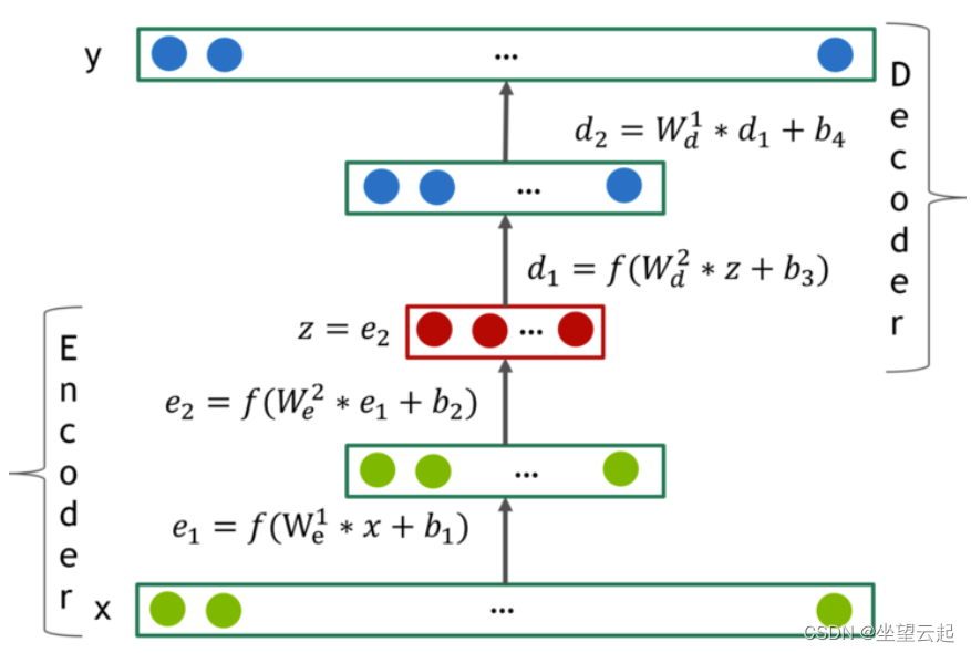 The figure above depicts a typical 4 Layer self encoder network . The encoder has 2 layer e_1 and e_2, The decoder has 2 layer d_1 and d_2. They mean z On the integration . These layers are represented by f(W * x + b), among f Are some nonlinear activation functions . If the range of the active function is smaller than the range of the data , The last layer of the decoder should remain linear . The author found the activation function in the hidden layer f It is very important to include non-zero negative parts , And in most of their experiments SELU unit .