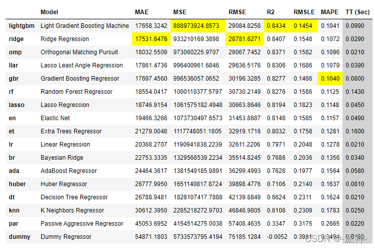 The execution of the setup() after , It is generally necessary to carry out compare_models() operation ,compare_models() The function of is to compare all models in the model library to evaluate performance .( If you know which model has the best performance, you can also not execute compare_mode, Direct execution of the following create_model(), But usually most people don't know which model has the best performance in advance .). compare_models() Will train all models in the model library , And use k Fold cross validation scores them for measurement evaluation . And print a score table , Evaluation indicators include : MAE、MSE、RMSE、R2、RMSLE and MAPE And training time .