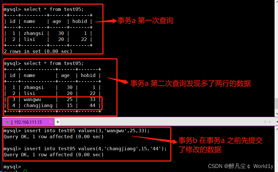 - 幻读:数据多次读取,数据总量不一致(一个事务对一个表中的数据进行了修改,这种修改涉及到表中的全部数据行。同时,另一个事务也修改这个表中的数据,这种修改是向表中插入一行新数据。那么,操作前一个事务的用户会发现表中还有没有修改的数据行,就好象发生了幻觉一样。)