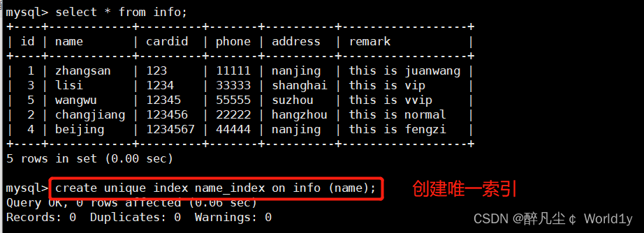 insert into info values (2,'wangwu','12345','222222','benjing','this is normal');
