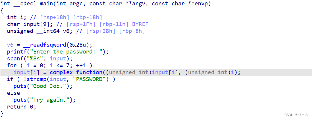 main The function logic is : First read the input input, After use complex_function Function to process input character by character , If the processed string and "PASSWORD" equal , The output Good Job, Otherwise output Try again.