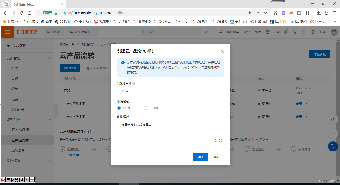 Fill in the rule name :1TO2, data format :JSON, Rule description : Device 1 sends a message to device 2 . spot “ confirm ”, Rule created successfully .