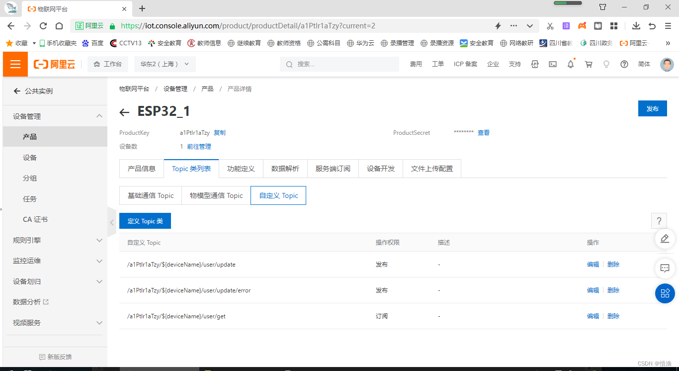 thus , We created products “ESP32_1”, And create its device instance “ESP32_1_0”. Build another product according to this method “ESP32_2”, And create its device instance “ESP32_2_0”. Note that both products have the same customization Topic.( Set in the future “ Cloud product flow ” Need to use )
