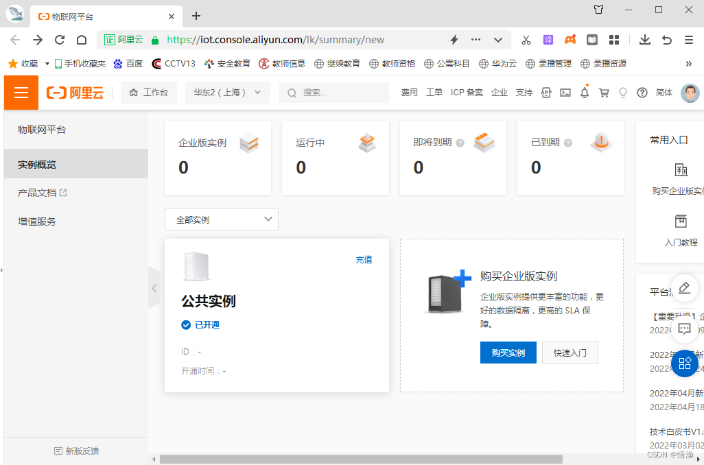 After code scanning and landing , Note that the default display of the above site is “ East China 2( Shanghai )”, Its site domain name is “cn-shanghai”, If you choose another site ,MQTT When connecting , You need to modify the site domain name , Consistent with .