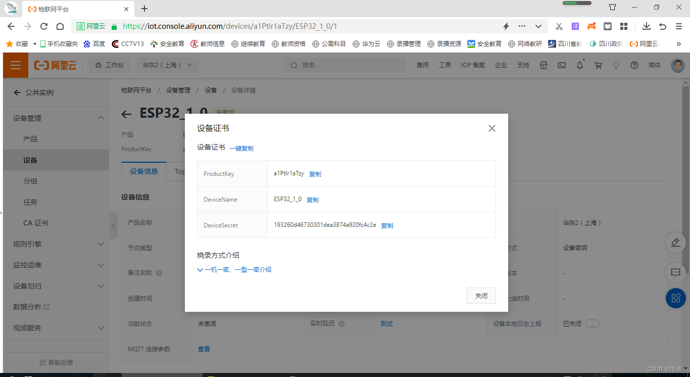 Text above “DeviceSecret” Several asterisks are displayed in the back , Click on the right “ see ”, Here's the picture , You get the equipment certificate information ( A triple ). Keep it well ,MQTT The connection must use this information .