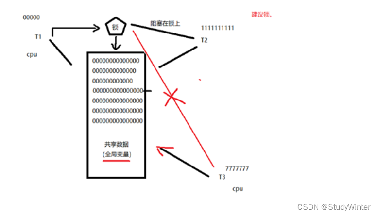 锁的使用:建议锁!对公共数据进行保护。所有线程【应该】在访问公共数据前先拿锁再访问。但,锁本身不具备强制性。