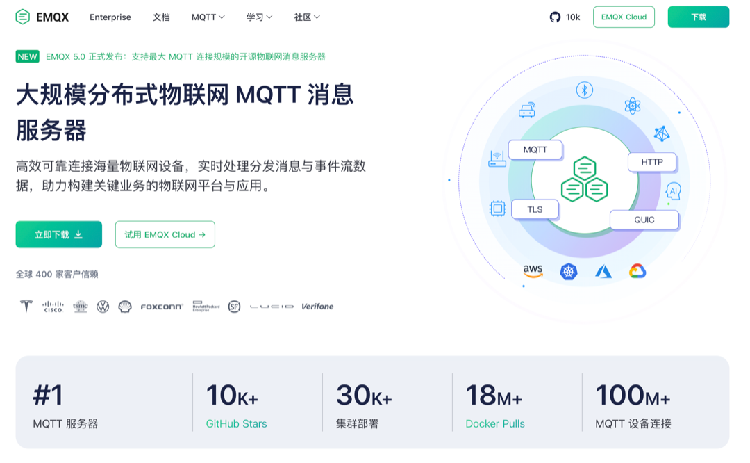 so far ,EMQX Near global Downloads 2000 Ten thousand times , Connected more than 1 Billion IOT devices , Accumulated global service 50 Multiple countries and regions 20,000 Multiple users , Including HUAWEI 、 China Electronics 、 China Mobile 、 China Telecom 、 The state grid 、 saic 、 GAC 、 TSMC 、 foxconn 、Ericsson、HPE、Cisco、Verifone、Telstra etc. . Our partners are all over China 、 In North America 、 European dominated 50 Several countries , The Internet of vehicles has been formed 、 Industrial Internet of things 、 telecom 、 Electric power 、 energy 、 Mature solutions for many industries such as finance , Help a large number of global brands break through technical bottlenecks 、 Accelerate industrial transformation and upgrading , The high-value transition from basic connection to data intelligent perception .