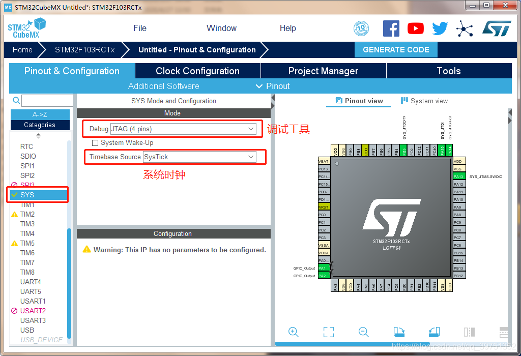 1、 stay STM32CubeMX-5.3.0 Configure specific ARM chip STM32F103RCTx, And save it as an engineering file myTest3.ioc;( Reference example 1)