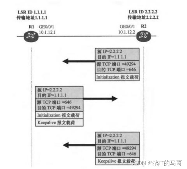 3, complete TCP Session creation after , The party with a large delivery address will give priority to the initialization message , It contains Some negotiation participants Send the number to the passive party . If the other party confirms the parameters , Will reply keeplive The message goes into Line confirmation , At the same time, send your own local initialization message , Carry your own parameters . The active party will also respond to Parameters are confirmed recognize , If there is no problem, it will also be sent keeplive message . Received by both parties keeplive message , Zedai surface Parameter negotiation succeeded , LDP Session successfully established .