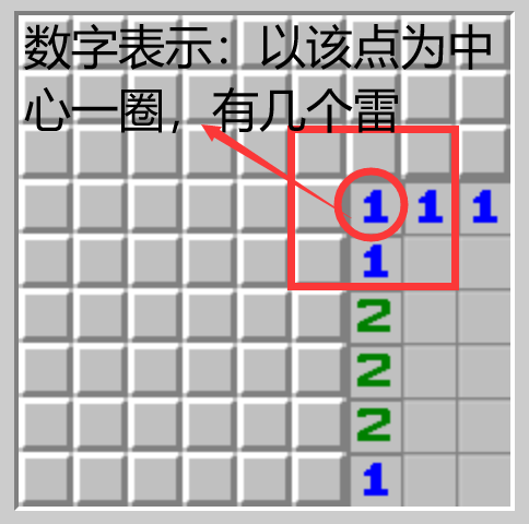 首先,我们知道扫雷即知道某点周围一圈的雷数,根据雷数踩下无雷的位置,踩下后显示该点雷数,依此类推,便可通关游戏。