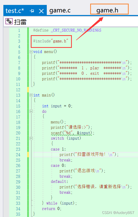 而,头文件#include<game.h>文件中,又包括了#include<stdio.h>