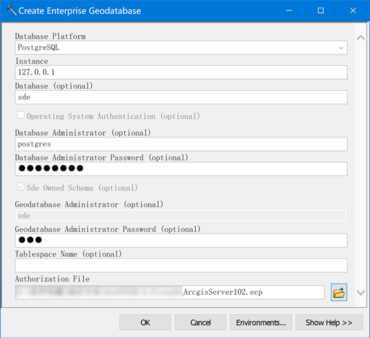 Use ArcGIS Toolkit to create enterprise geographic databases , The parameters are as follows :