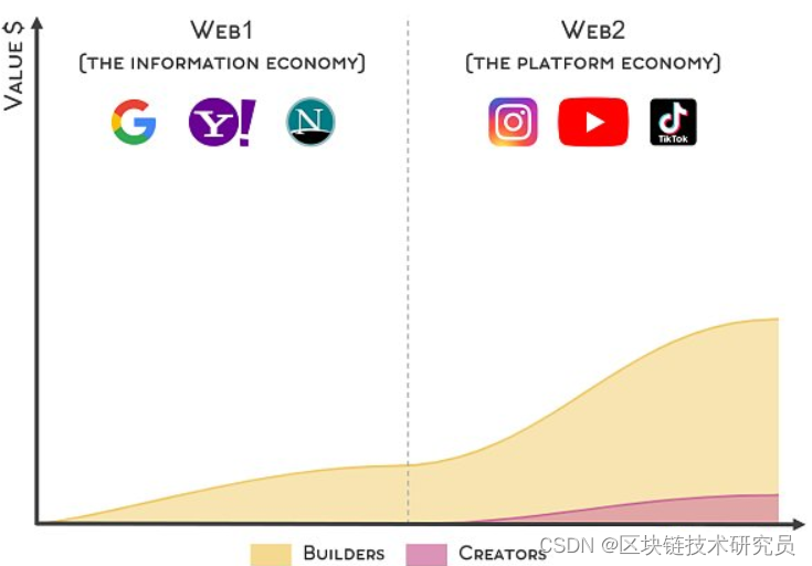 Web2 允许创作者加入互联网并分享其部分价值,如下所示: