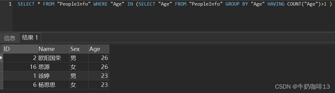 SELECT "Age",COUNT("Age")repateNumber FROM "PeopleInfo" GROUP BY "Age" HAVING COUNT("Age")>1