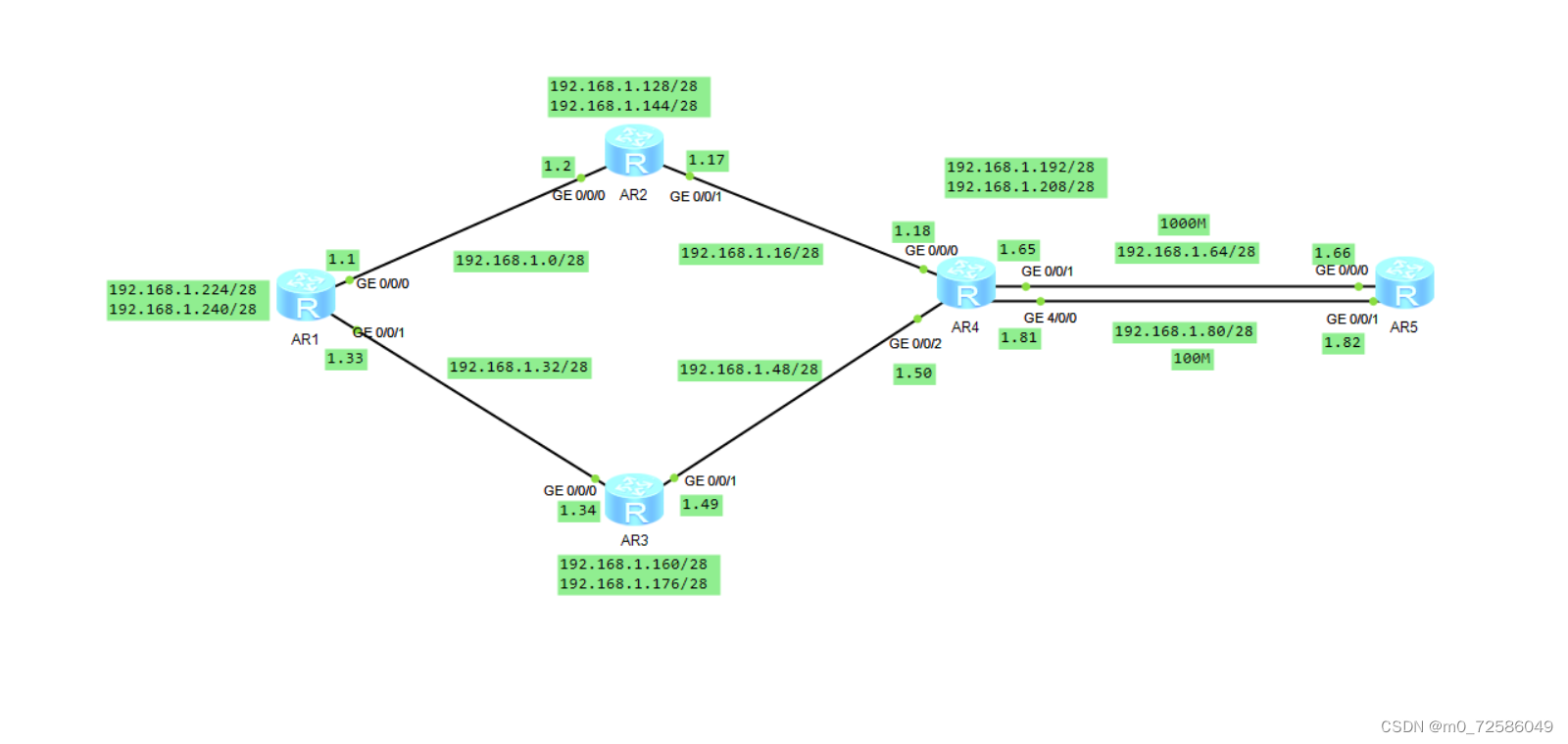 1. except AR5 The loopback address of is fixed outside , All other network segments need to be based on 192.168.1.0/24 Make reasonable IP Address partition