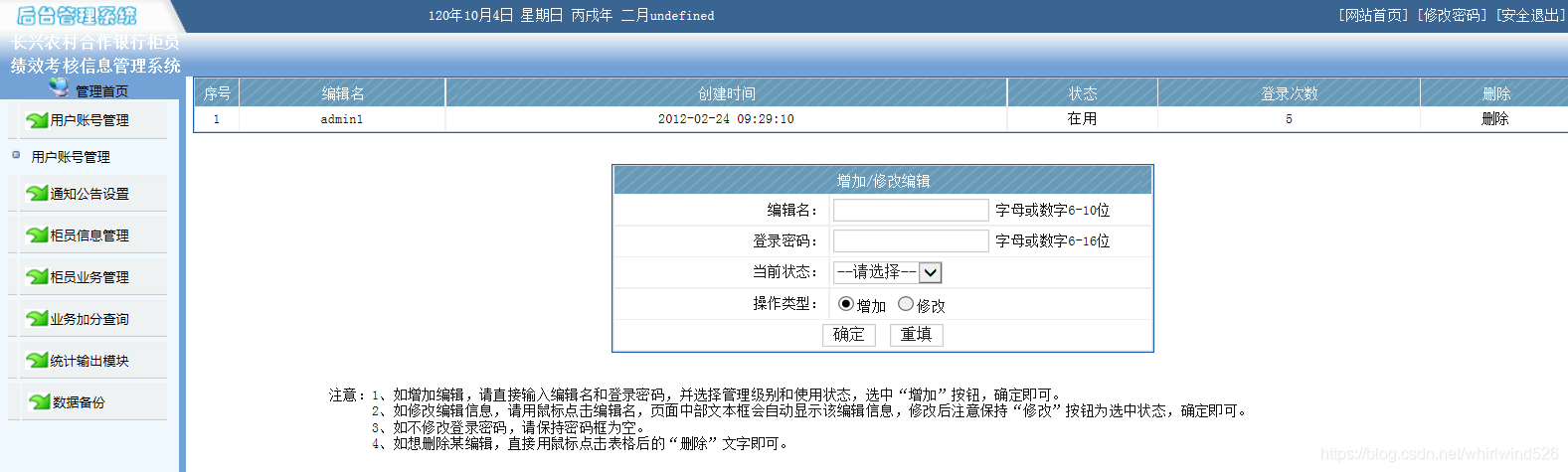 2.3 管理员界面:登入后,记录柜员工作情况:输入柜员工号,柜员名字,记录业务笔数,最后一栏并记录柜员员工加减分情况(笔数处于10的整数部分为加减分情况,以10分为上限)。除此之外,管理员还能对普通柜员的权限进行修改,删除不必要的用户。