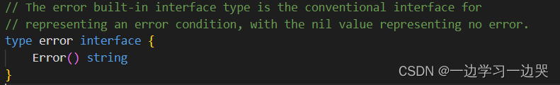 从前言中可以看出来,error接口十分简单。要实现error接口,只需要自定义一个结构体,实现Error()方法即可。