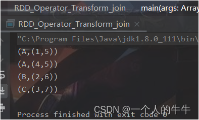 函数说明:在类型为(K,V)和(K,W)的RDD上调用,返回一个相同key对应的所有元素连接在一起的(K,(V,W))的RDD。
