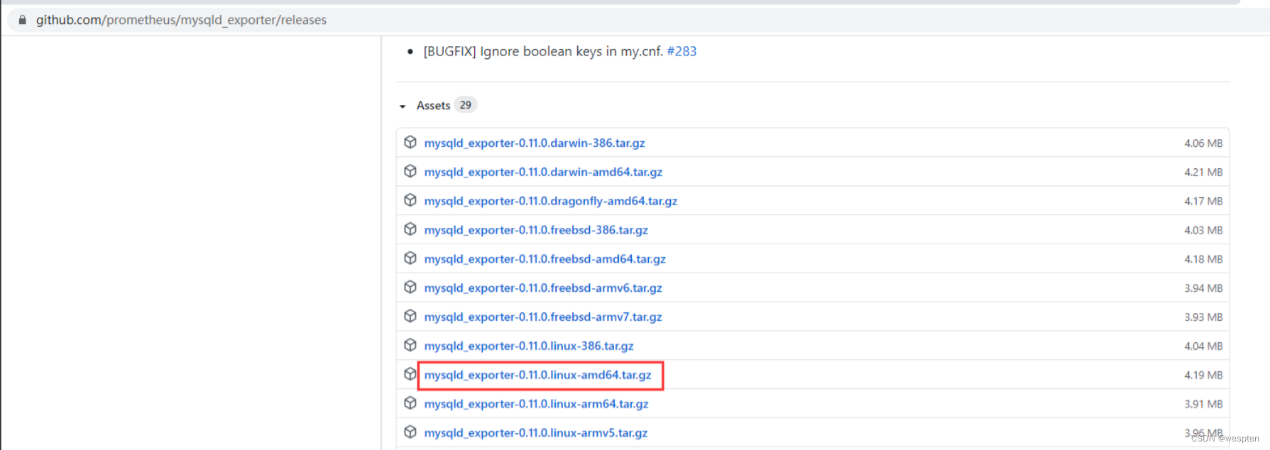 此下载地址一般只有最新版,如果想要下载其他版本,需要到github上Mysqld_exporter的github下载地址:Releases · prometheus/mysqld_exporter · GitHub