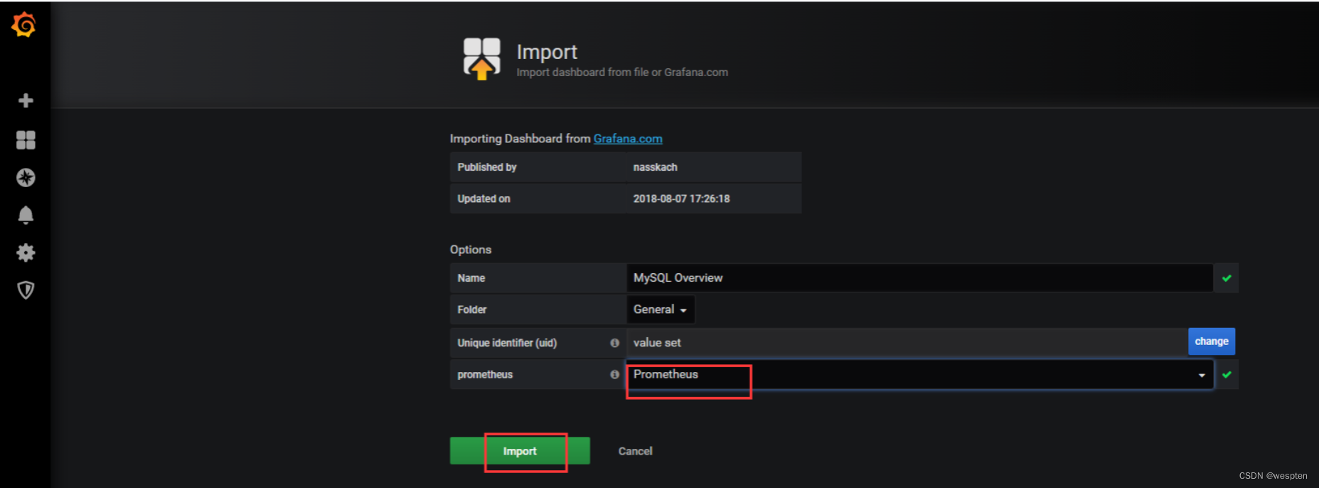 输入仪表盘的名称,选择数据源,点击导入即成功创建仪表盘。