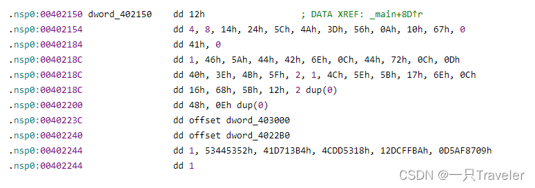 Pass the first 15 Line code , We know that the input is correct flag And byte_402130[v4 % 16] XOR equals dword_402150[v4], This v4 Is an array subscript , The maximum is 41