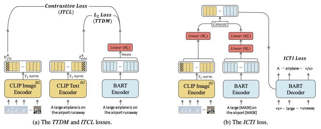VLKD的整体结构非常简单,如下图所示,将原来CLIP模型中的text encoder替换成预训练BART的encoder + decoder,通过知识蒸馏的方式让BART的encoder和decoder学到CLIP中的跨模态知识。这里的跨模态知识,指的是让BART能够处理图像信息,借助CLIP中已经将图像和文本的表示映射到同一空间的能力,将BART对文本的表示也映射到这一空间。