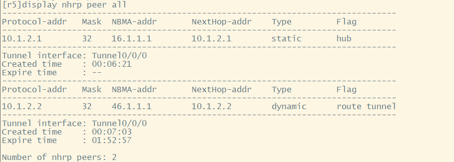 [r5-Tunnel0/0/0]nhrp entry 10.1.2.1 61.1.1.1 register