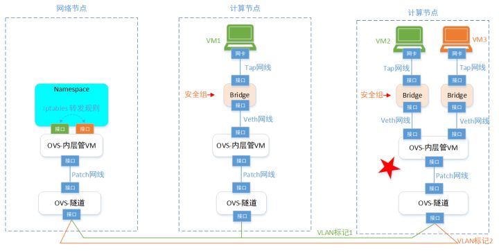 That's what we learned before OVS chapter , You can know , In order to achieve the above mentioned OpenStack The purpose of network virtualization . The simplest implementation is to add one to each physical server OVS Virtual switch ; Then each VM All connected OVS On port , Each port is grouped by , Put the corresponding VLAN label . The basic requirements can be achieved .