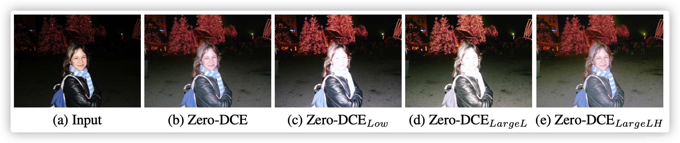 训练数据的影响。为了测试训练数据的影响,我们在不同的数据集上重新训练了 Zero-DCE:1)原始训练集中的 2422 张图像中只有 900 张低光图像(Zero-DCE Low),2)9000 张未标记的低光图像在 DARK FACE 数据集 [37](Zero DCE Large L)中提供,以及 3)来自 SICE 数据集 [4](Zero - DCE Large LH)中 Part1 和 Part2 子集的数据增强组合的 4800 张多曝光图像。如图 6(c) 和 (d) 所示,在去除过度曝光的训练数据后,Zero-DCE 倾向于过度增强光线充足的区域(例如,面部),尽管使用了更多的低 -光图像,(即Zero DCE Large L )。这些结果表明在我们的网络训练过程中使用多曝光训练数据的合理性和必要性。此外,当使用更多的多重曝光训练数据(即 Zero - DCE Large LH)时,Zero DCE 可以更好地恢复暗区,如图 6(e)所示。为了与其他基于深度学习的方法进行公平比较,我们使用与它们相当数量的训练数据,尽管更多的训练数据可以为我们的方法带来更好的视觉性能。
