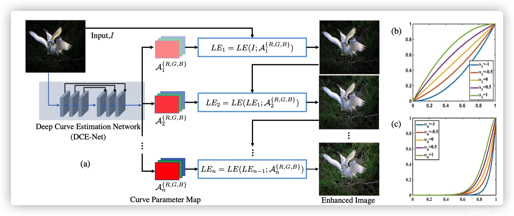图 2:(a)Zero - DCE 的框架。 DCE-Net 旨在估计一组最佳拟合光增强曲线(LE-曲线),以迭代地增强给定的输入图像。 (b, c) LE - 具有不同调整参数 α 和迭代次数 n 的曲线。在(c)中,α 1 、α 2 和α 3 等于-1,而n等于4。在每个子图中,水平轴表示输入像素值,而垂直轴表示输出像素值。