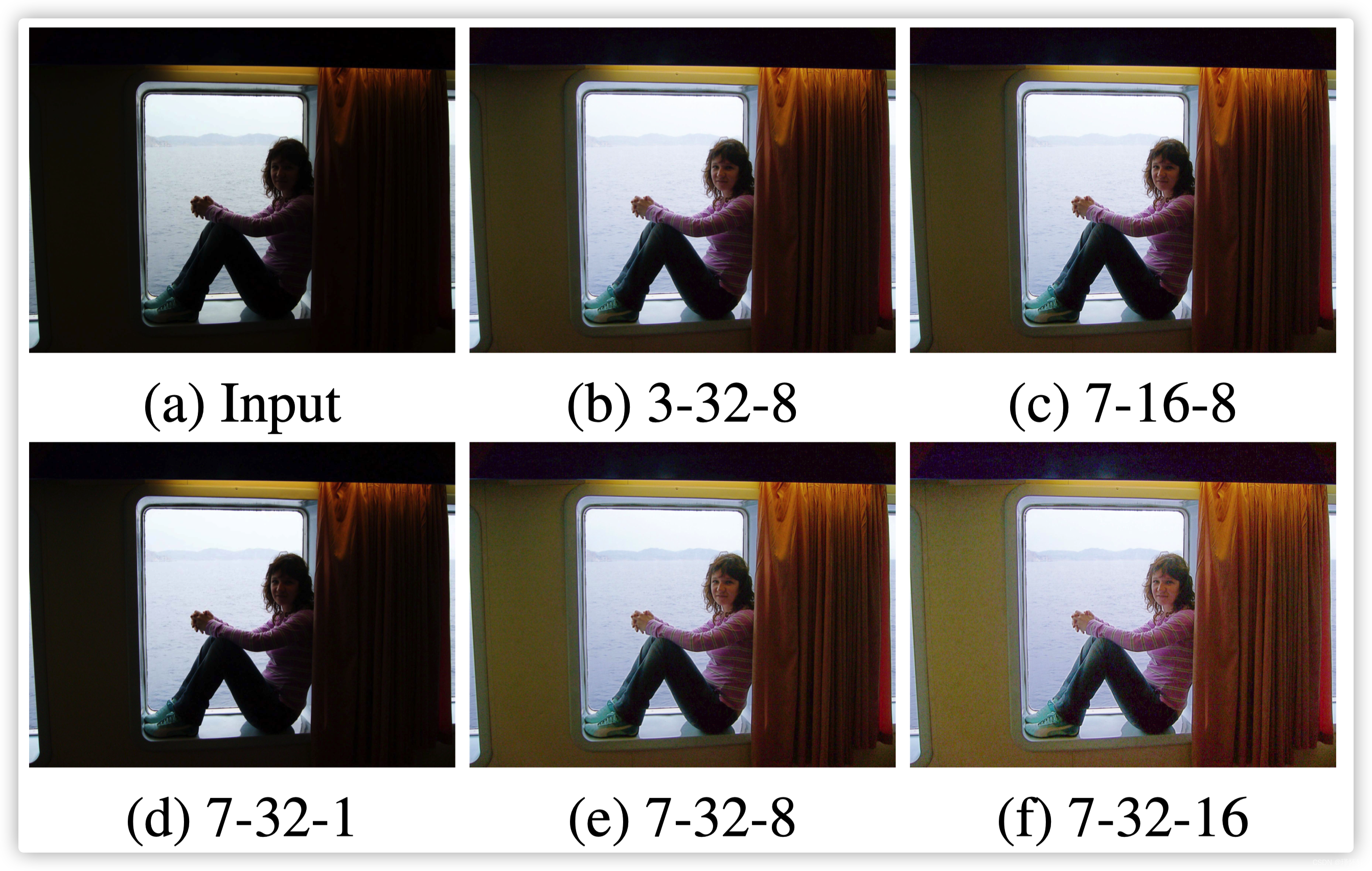 在图 5(b) 中,只有三个卷积层,Zero - DCE 3-32-8 已经可以产生令人满意的结果,表明零参考学习的有效性。 Zero - DCE 7-32-8 和 Zero DCE 7-32-16 产生最令人愉悦的视觉效果,具有自然曝光和适当的对比度。通过将迭代次数减少到 1,在零 - DCE 7-32-1 上观察到性能明显下降,如图 5(d) 所示。这是因为仅单次迭代的曲线调整能力有限。这表明我们的方法需要高阶曲线。鉴于其在效率和恢复性能之间的良好折衷,我们选择零 - DCE7-32-8 作为最终模型。