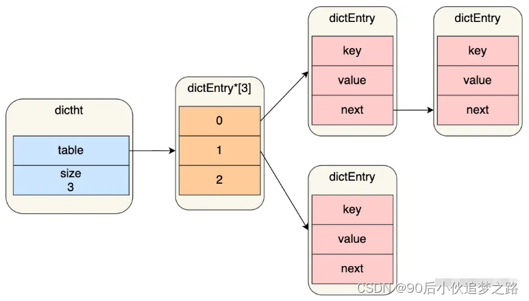 - ditctht structure , Represents the structure of the hash table , Structure stores a hash table array , Each element in the array points to a hash table node structure (dictEntry) The pointer to ;