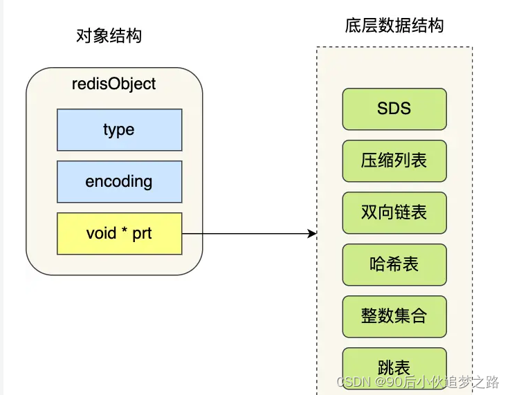 In particular ,void * key and void * value The pointer points to Redis object ,Redis Each object in the is represented by redisObject Structural representation , Here's the picture :