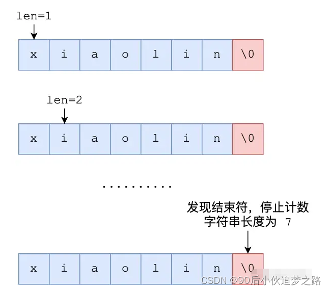 for instance ,C Language get string length function strlen, Is through each character in the character array , And count , The characters encountered are “\0” after , Will stop traversing , Then return the number of characters that have been counted , Is the length of the string . The image below shows strlen Function execution flow :