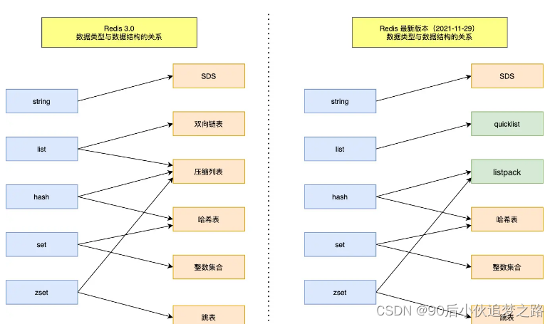 I drew a picture of Redis data type ( Also called Redis object ) And the underlying data structure , On the left is Redis 3.0 Version of , That is to say 《Redis Design and implementation 》 The version of this book , It's still a little out of date now , On the right is now Github Abreast of the times Redis Code ( The official version has not been released yet ).
