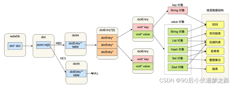 - dictEntry structure , Represents the structure of the hash table node , In the structure **void * key and void * value The pointer , key Pointing to String object , and value You can point to String object , You can also point to objects of collection type , such as List object 、Hash object 、Set Objects and Zset object .