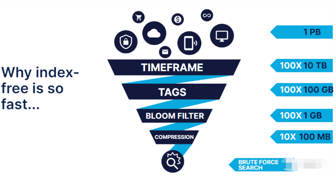 1PB的數據存儲,沒有了全文索引的情况,直接暴力檢索一個關鍵字,肯定是超時的,如果先經過時間,標簽以及bloomfilter進行過濾篩選後,再執行暴力搜索,則需要檢索的數據量會小的多。