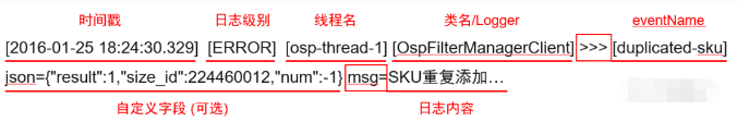 時間戳,日志級別,線程名,類名,eventName,和自定義字段將被日志采集Agent解析後和其他元數據如域名,容器名或主機名一起以JSON格式上報。