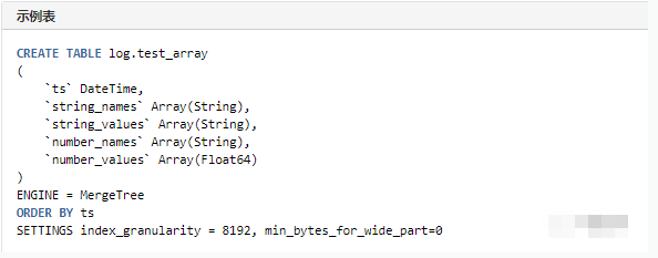 後來借鑒了Uber日志存儲的方案,每種數據類型的字段,分別創建兩個數組,一個保存字段名稱,另一個保存字段值,名字和值按順序一一對應,查詢時,使用clickhouse的數組檢索函數來檢索字段,這種用法支持所有的Clickhouse函數計算。