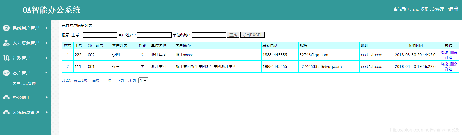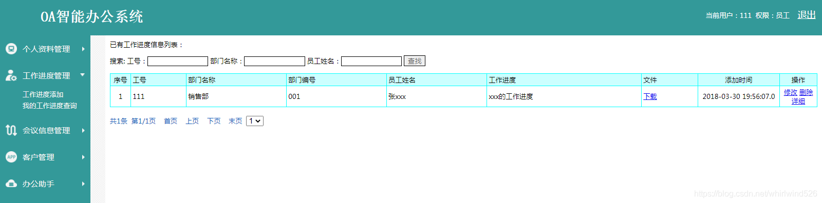 This module contains employee information management 、 Department information management 、 Employee contract management 、 Several functional modules of employee work progress management