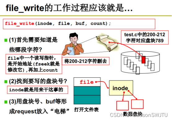 - step 2: According to the character position and index to be operated ( The mapping relationship ) Calculate the disk block number corresponding to the character stream for reading and writing ; The code behaves as file_write(inode, file, buf, count) , among inode yes index+fcb( Indexes + Index block ),file The file character stream position range is stored ( Such as 200~212),buf Memory buffer address ,count The number of characters ;