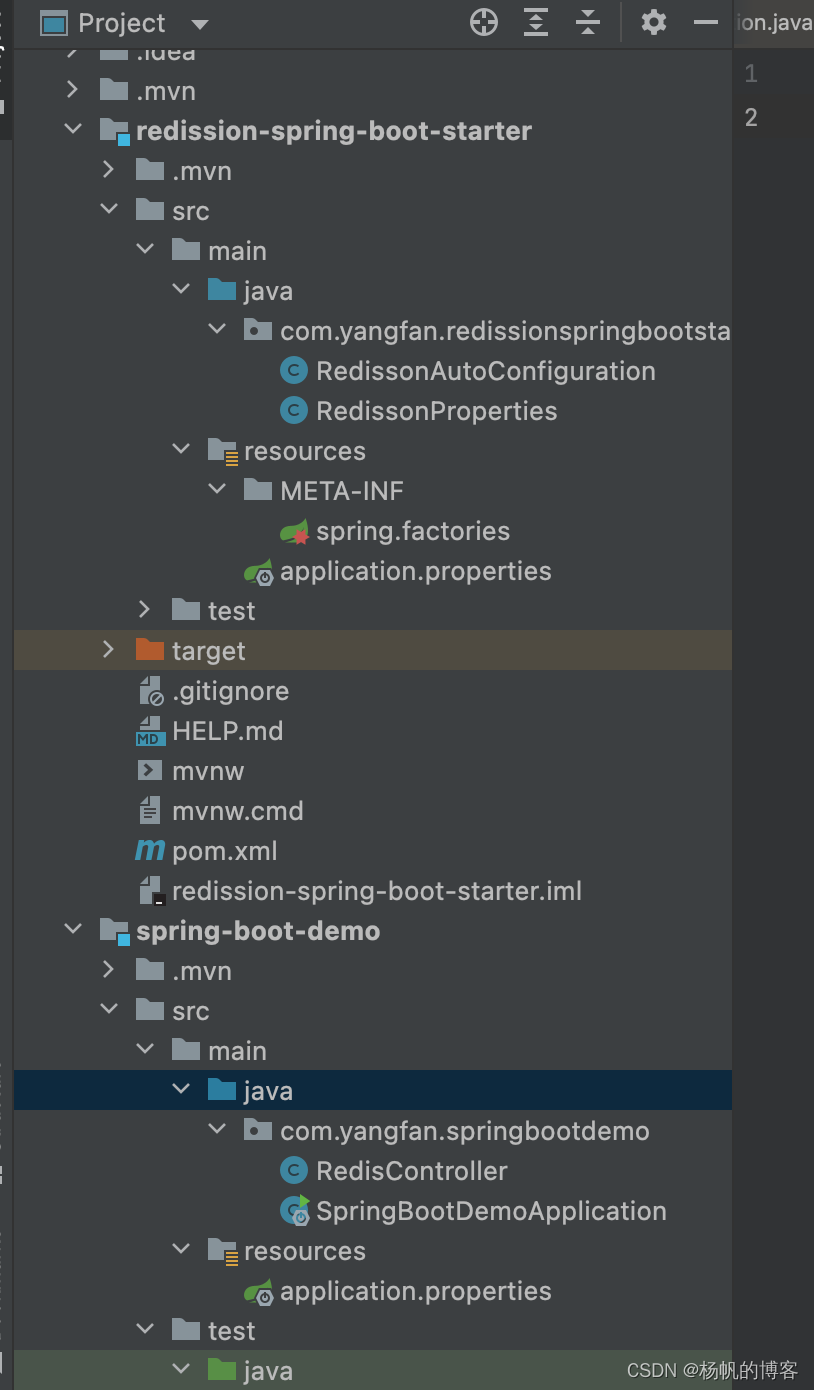 First, we need to build a multi moudle engineering , Under this project, two module, One redission-spring-boot-starter The other is the quotation change starter Of spring-boot-demo, The specific project structure is shown in the figure below , The following describes how to establish these two projects ;